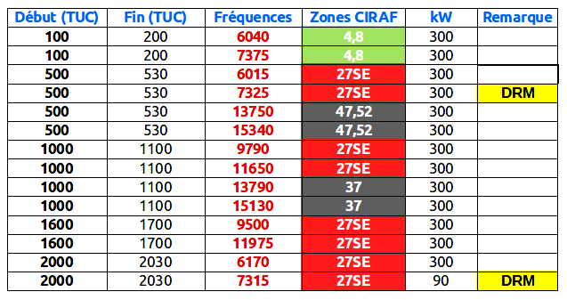 Le Radio Club du Perche a regroupé les informations fournies sur la page Horaires et Fréquences dans un tableau complété ci-dessous avec la liste des zones CIRAF concernées :