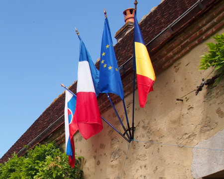 Les drapeaux flottent sur le mur au-dessus de l’entrée de la fermette de La Viône : la Slovaquie, la France, L’Union européenne et la Roumanie.
